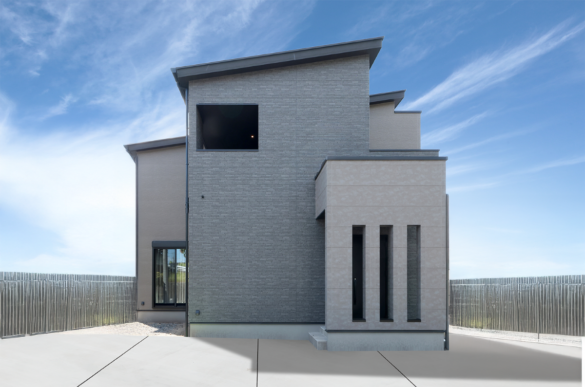 3色で貼り分けたシックな外観は、スリットの入った壁を立ち上げることで、道路からの視線を遮りつつ、開放感を損なわない設計の工夫がされています。内観は白を基調としたシンプルモダンなデザインとなっており、木質感を徹底的に無くすことで、美術館のようなスタイリッシュな空間となっています。また、2階には屋根付きバルコニーがあり、夏はプール、秋は映画鑑賞、春は付近の公園から桜が覗ける、四季も楽しめる空間となっています。角地にありながら“子どもが走り回れるバルコニー”で叶えた、週末時間を彩る理想的な邸宅です。