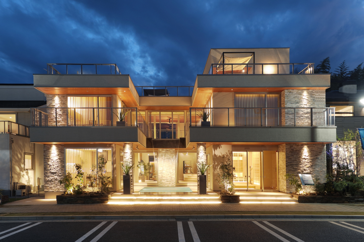 2階からダイナミックに滝が流れるリゾートライクな外観。まるで別荘地に訪れたかのような非日常感漂うデザインで、家族だけでなく訪れる方を日々の喧騒を忘れさせてくれます。室内は、滝を中心としたコの字型の間取りで、LDKをはじめ、2階のホール、玄関ホールなど、あらゆる空間で滝の流れを見て、楽しむことができます。3階にはバーに訪れたような上質な空間となっており、家族だけで過ごすプライベートリビングがあります。屋上庭園と隣接することで、外と中の空間がシームレスにつながり、ホームパーティや屋外ホームシアターなど、暮らしの幅が広がります。暮らしの中で人生を豊かにしてくれる仕掛けが詰め込まれた、贅沢な空間となっています。