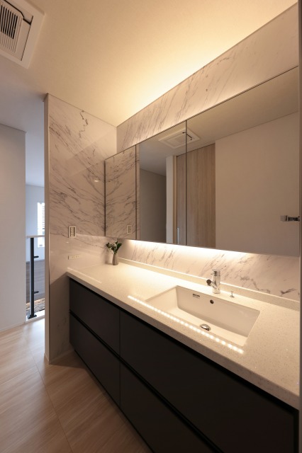 洗面台の機能や素材、色合いにこだわる事も大事ですが、間接照明を照らしたり