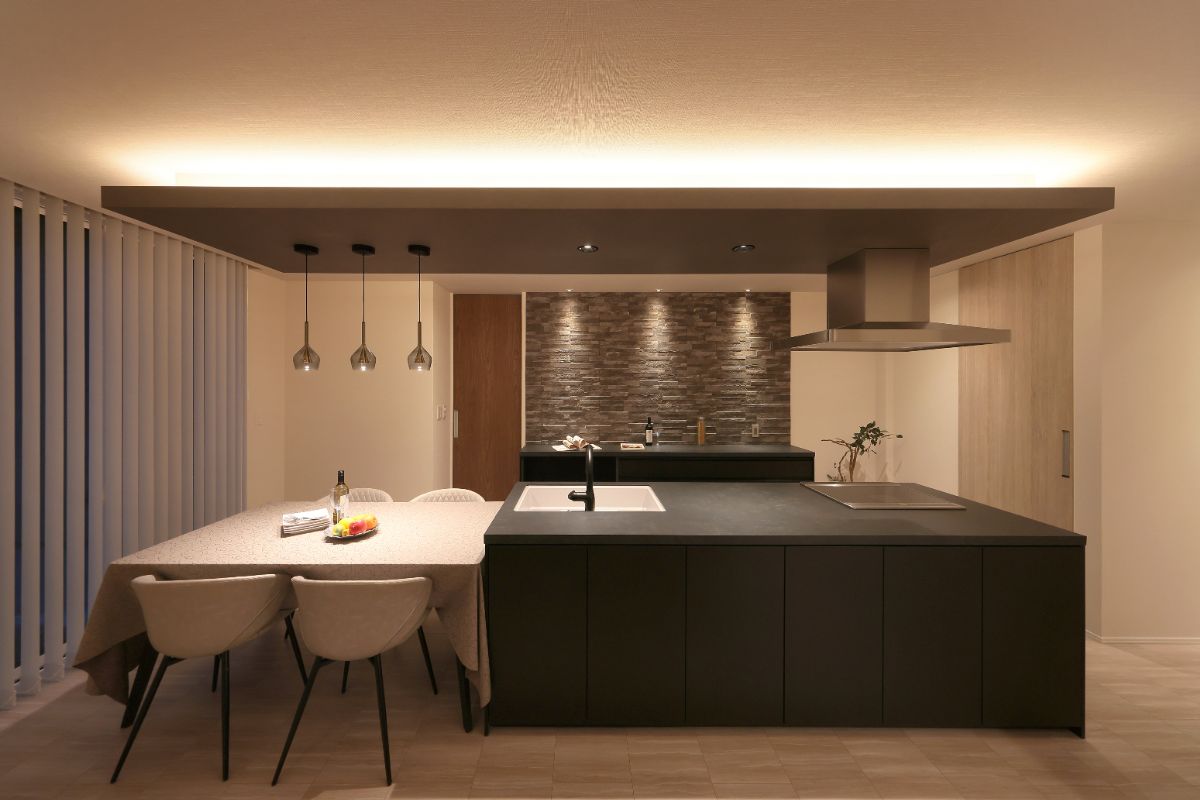 キッチンはシックな色味で統一し、空間を引き締める存在感のあるデザインに。さらに、キッチンからはリビング全体を見渡せる間取りとなっており、調理をしながらテレビを眺めたり、スキップフロアやリビングで過ごす家族の様子を感じることができます。
