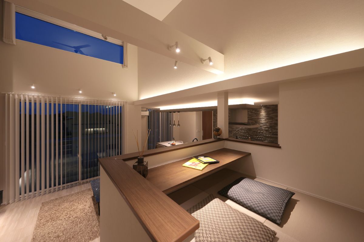 また、高天井を活かしてスキップフロアを設けることで、リビングにいながら半個室のように過ごせる空間を実現。フロア下はリビングの貴重な収納スペースとして活用でき、デザイン性と機能性のバランスが取れた空間に仕上がりました。