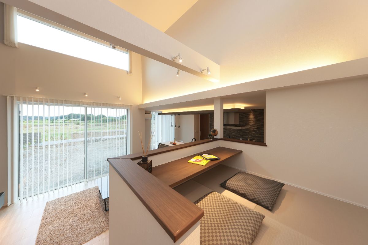 リビングを高天井にすることで、天井付近の窓からたっぷりと光を取り込み、さらに南側の大きな窓からも採光を確保。LDK全体が明るく、日の暖かさを感じられる心地よい空間となっています。