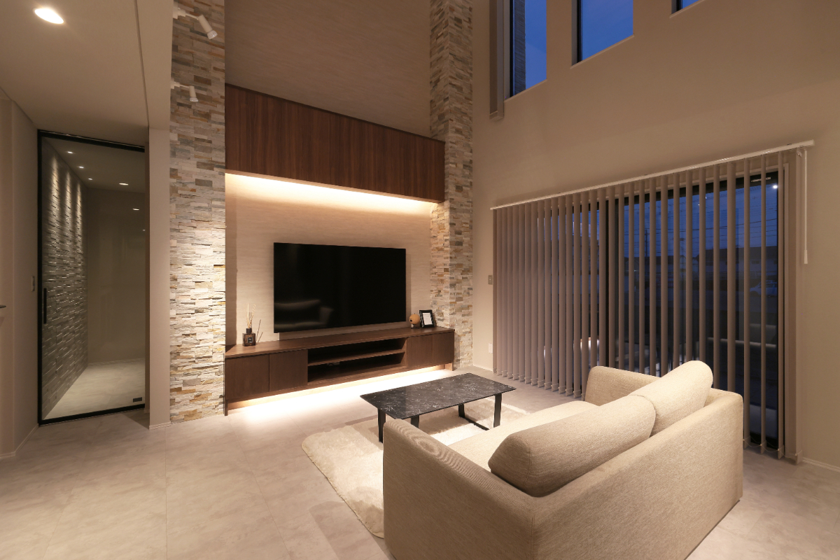 ◇天然石の貼られた柱が印象的な吹き抜けリビング