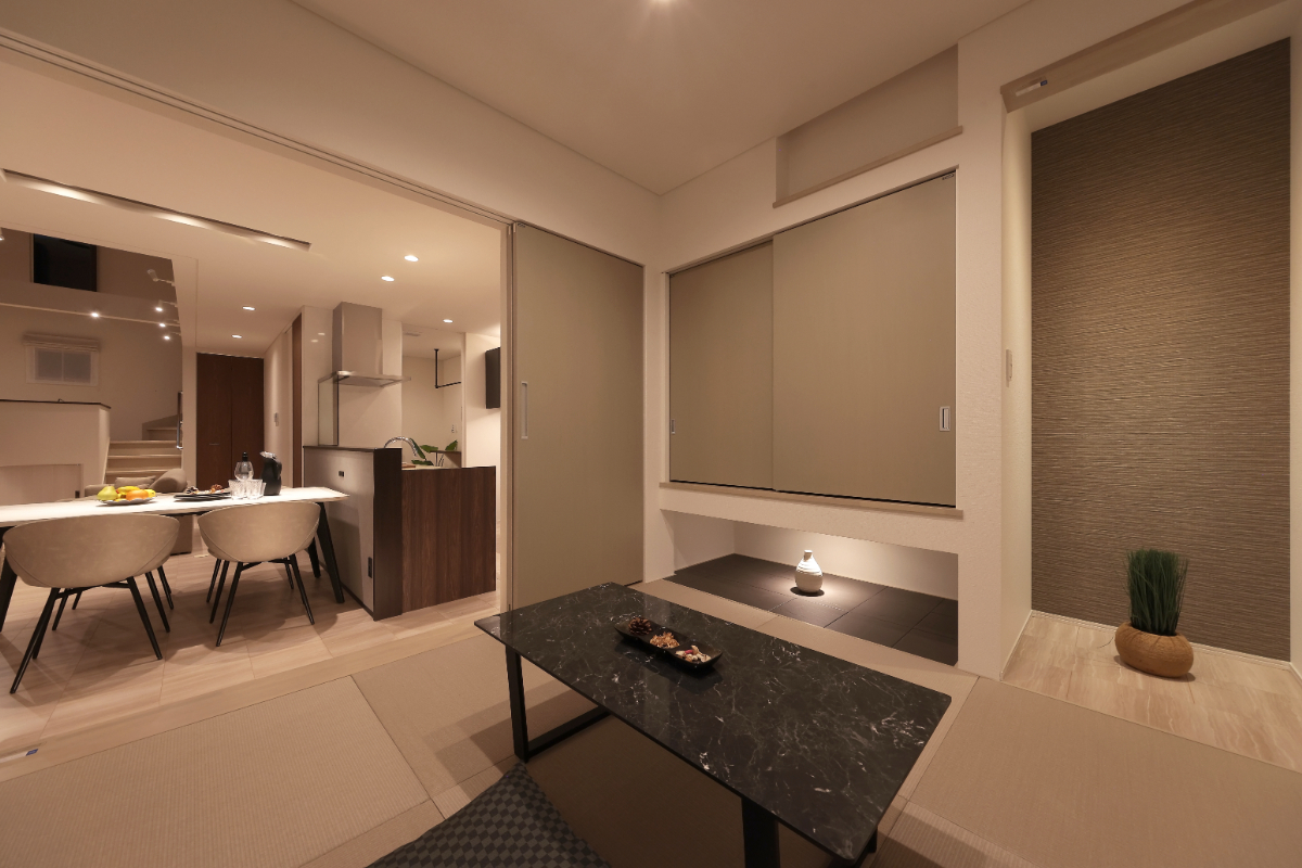 吹き抜けのある開放的なリビング、和モダンな和室、スキップフロアが見どころです。